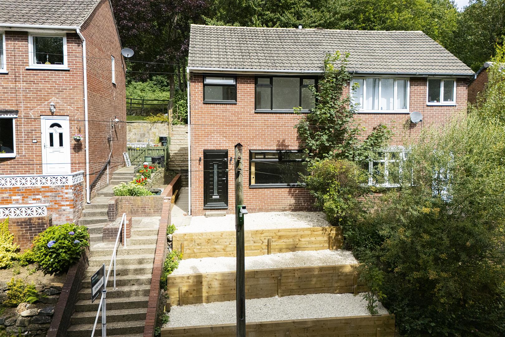 At the front of the property, there is a tiered and pebbled garden with steps leading up to the front door. A flagged pathway gives access down the side of the property to the rear. The rear garden comprises a tiered and pebbled garden with steps leading up to the top of the garden, along with fenced and walled boundaries. There is a lawned garden area and outdoor lighting.